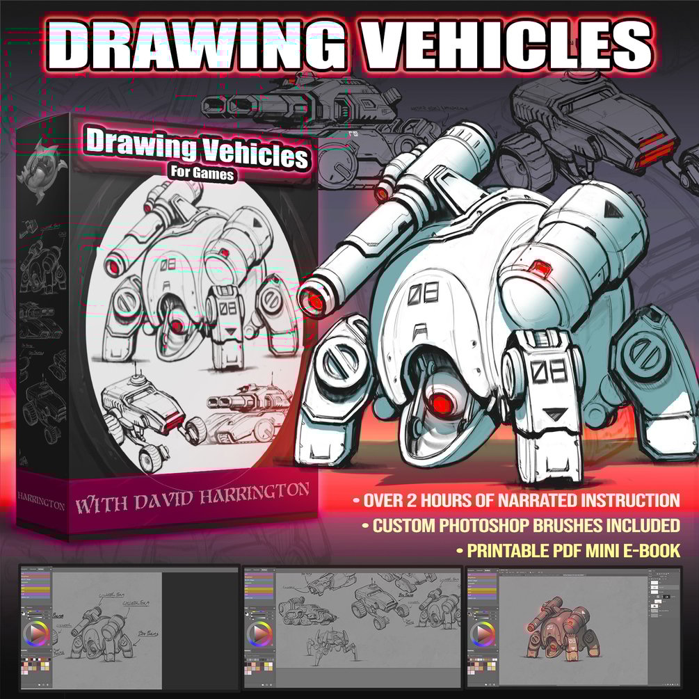 This tutorial is all about designing badass vehicles and robots for video games. I’ll take you step-by-step through my whole process, from fast ‘n loose thumbnail sketches to clean, polished final designs. It’s fun, super chill, and packed with tips you can use right away!
