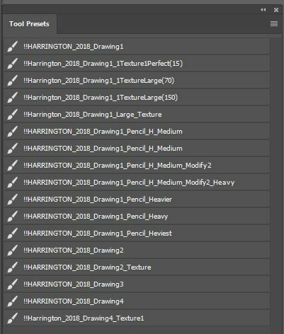 -These are my personal texture pencil brushes that I use for drawing. They are saved as tool presets (.tpl) so it saves every aspect of the brush and tool. Simply load the tool presents into your tool presets palette and select them from there.